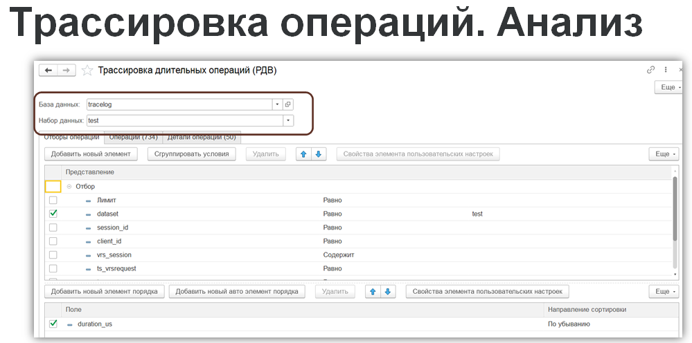 После этого через специализированную обработку «Трассировка длительных операций» мы выполняем детальный анализ того, какие бизнес-операции выполнял пользователь или фоновое задание и из каких событий технологического журнала состояли их действия.