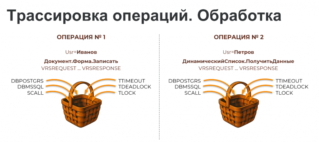 Таким образом, мы формируем «корзину» событий – по сути, реконструкцию одной пользовательской операции или фонового задания.