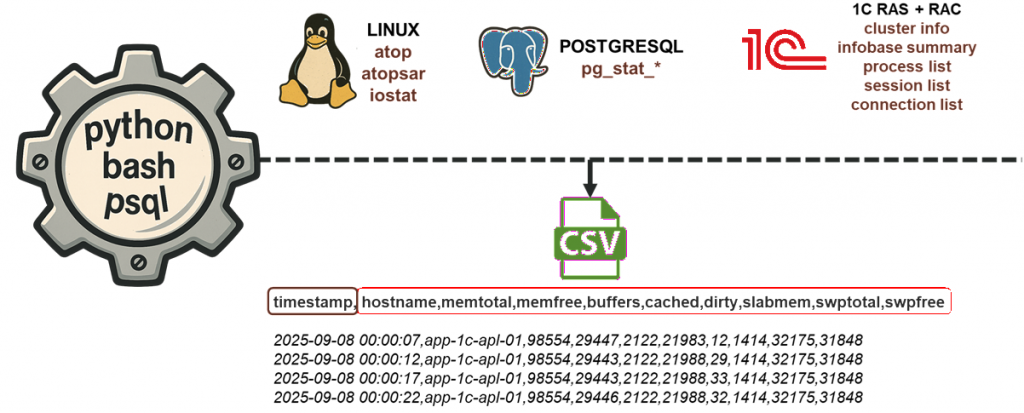 Собираем данные из разных источников. С помощью простых инструментов на Python и Bash приводим их к единому формату – стандартному CSV. В CSV сохраняем временную метку, имя хоста, счетчики и их значения.