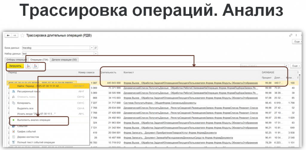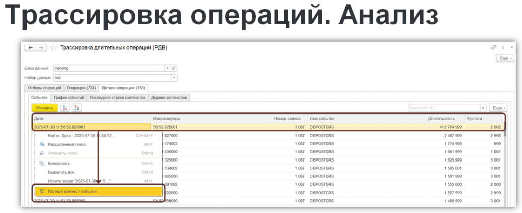 Каждая строка – это одно действие пользователя: с временной меткой и длительностью. Например, обновление динамического списка – 445 секунд. Очевидно, что это слишком долго. Вызываем «Выполнить анализ операции» и получаем список всех событий внутри.