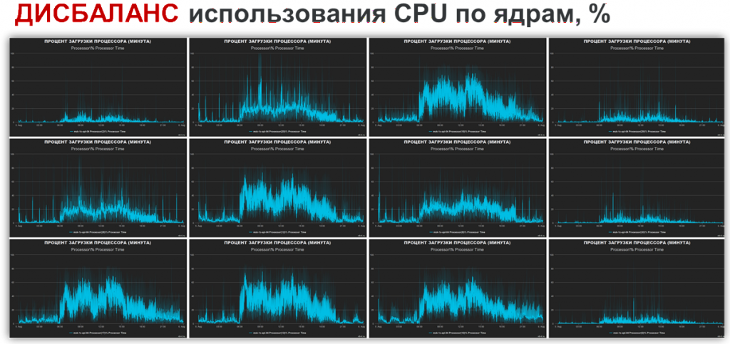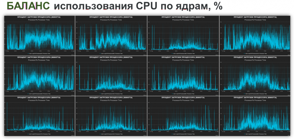 Пример. Мы сделали визуализацию загрузки CPU. Видно, что 12 ядер процессора загружены неравномерно.