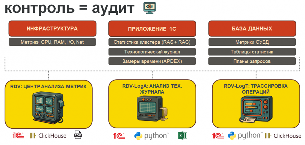 Поэтому на первом этапе мы используем простые базовые инструменты: встроенные возможности операционной системы и самой 1С. Это позволяет быстро собрать первичную картину без внедрения на серверах сторонних решений, требующих длительной настройки.