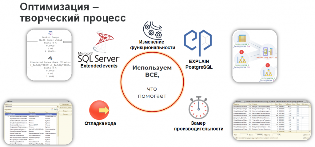 Здесь нет жесткого регламента или набора шагов в духе «сделай раз, сделай два, сделай три». В каждом случае это отдельная инженерная задача. Мы используем все, что помогает: отладку кода, замеры производительности, анализ планов запросов. Иногда приходится менять саму методологию работы или функциональность.