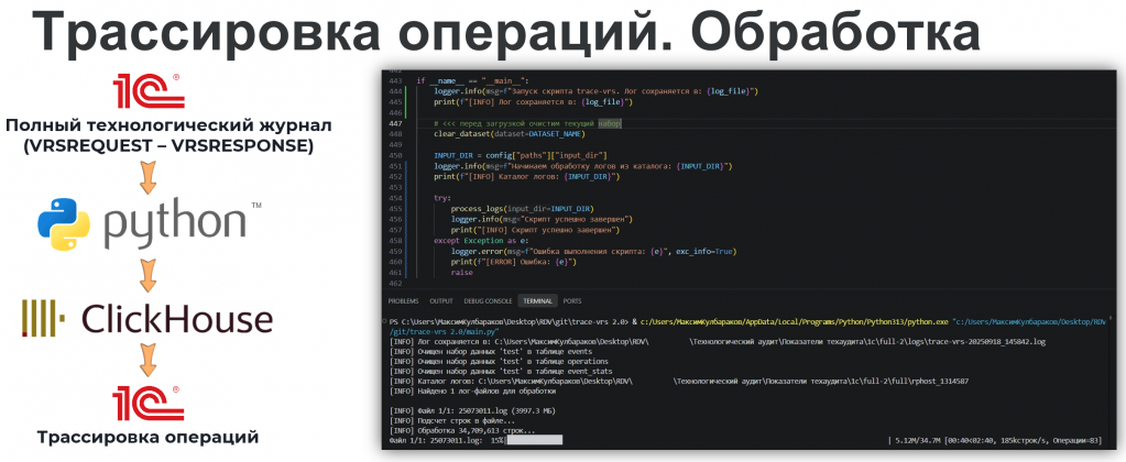 Алгоритм следующий: полный технологический журнал обрабатывается Python-скриптом, определяются связанные в одну операцию события, загружаются в ClickHouse.