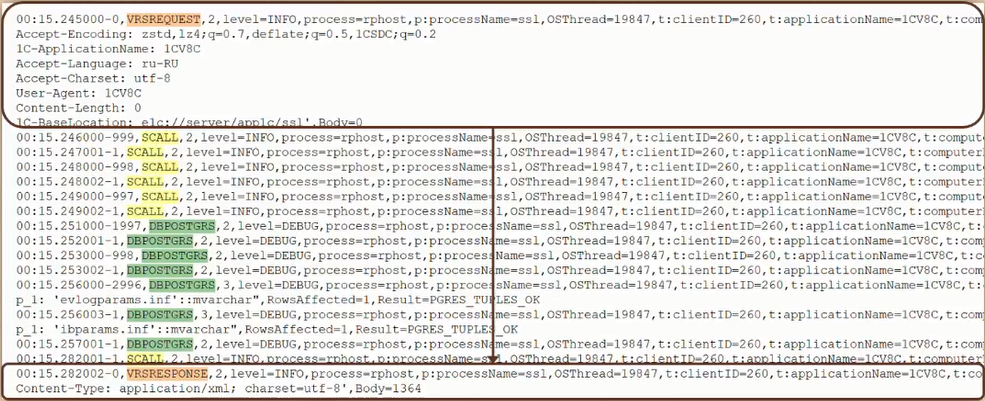 Мы знаем, когда это произошло – у нас есть временная метка из замера времени. Дальше мы определяем границы операции. Они задаются двумя событиями: начало – VRSREQUEST и конец – VRSRESPONSE. Между ними собираем все события, которые относятся к этой операции: запросы, серверные вызовы, SQL, ожидания блокировок, исключения, таймауты – все, что произошло внутри.