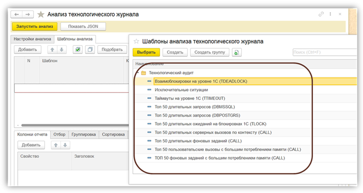 Второй важный момент – предопределенные шаблоны анализа. Мы заранее настраиваем аналитику: как именно хотим разбирать журнал. Дальше остается указать путь к технологическому журналу, выбрать шаблон, нажать «Запустить» и получить результат в виде Excel-таблиц.