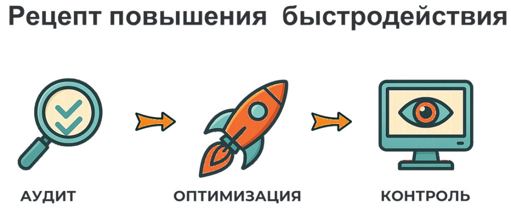 Чтобы стабилизировать ситуацию и оптимизировать систему 1С, мы используем довольно простой рецепт из трех шагов: аудит, оптимизация и контроль.