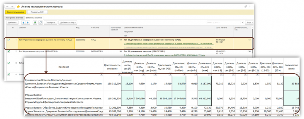 Дальше все просто: указать путь к журналу, выбрать список шаблонов и нажать «Запустить». В результате получите Excel-таблицы с полезными данными: проблемные операции, их контекст кода и другие метрики.