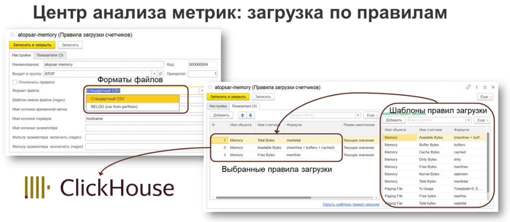 Механизмы обработки преобразовывают и нормализуют данные из файлов, после чего экспортируют их в ClickHouse, где уже хранятся значения счетчиков.