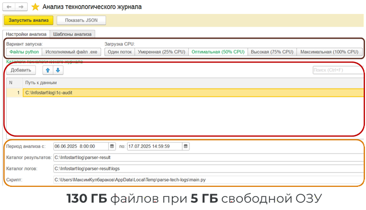 При этом она минимально использует оперативную память. Один из недавних кейсов – анализ 130 ГБ технологического журнала на ноутбуке, где было около 5 ГБ свободной памяти. Этого оказалось достаточно для работы.