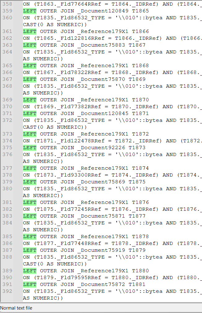 Видим текст запроса и большое количество LEFT JOIN. Это сразу наводит на мысль о неявном обращении к полям составного типа и о потенциальной проблеме в самом запросе.