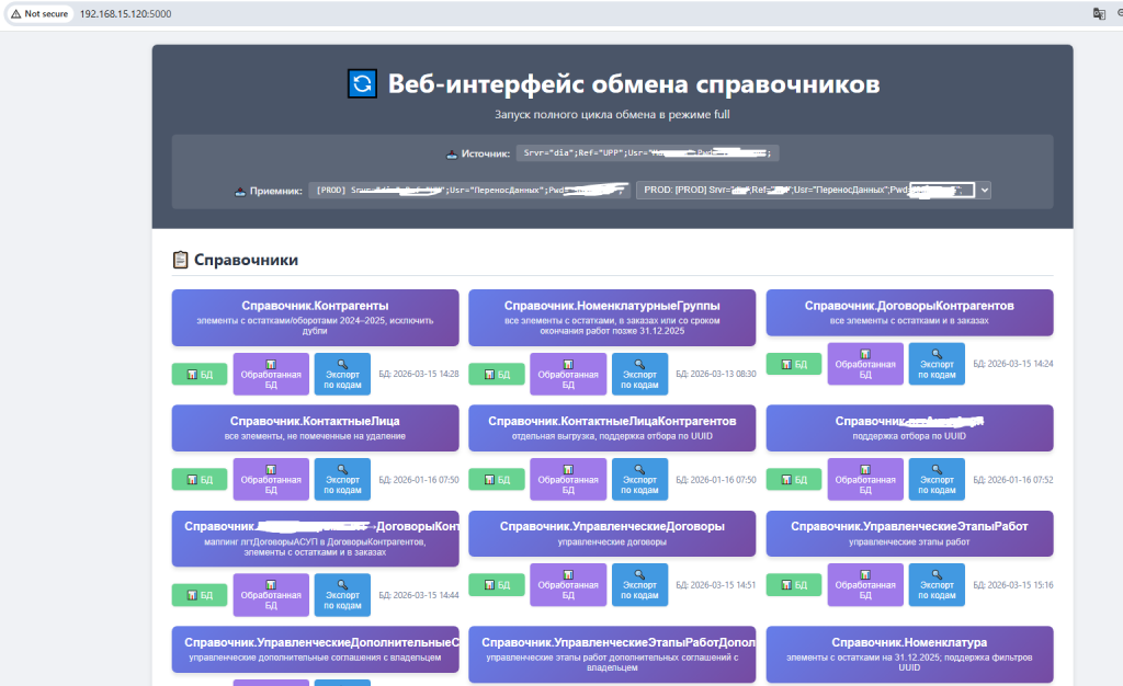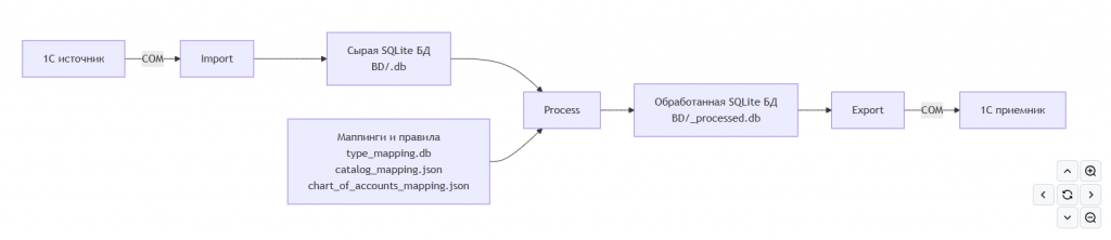 importчитает данные из1С:УППчерез COM и сохраняет их в сырые SQLite-базы.processпреобразует данные под модель1С:УХ, используя маппинги, правила обработки, свертки счетов и подготовку ссылок.exportзаписывает обработанные данные в1С:УХчерез COM.