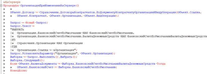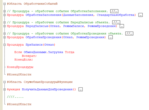• #Область и #КонецОбласти - не влияют на логику работы. Их задача — «порядок» в коде. Они позволяют сворачивать логические блоки (например «ОбработчикиСобытий», «СлужебныеПроцедурыИФункци»).
