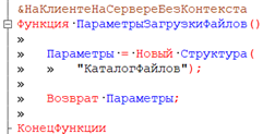 • &НаСервереБезКонтекста – выполняется на сервере, но без доступа к контексту формы (реквизитам, элементам управления). Используется для получения статических данных или выполнения вычислений, не зависящих от формы. Повышает производительность за счёт минимизации трафика между клиентом и сервером.
