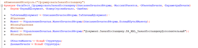 • #Вставка и #КонецВставки/ #Удаление и #КонецУдаления – используется в расширениях конфигурации для модификации кода в процедурах с аннотацией &ИзменениеИКонтроль: добавляет или удаляет часть кода.