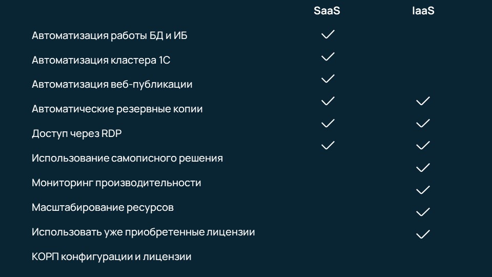 Мы решили войти в положение таких компаний и подумать, как можно взять лучшее из IaaS и SaaS. Получить максимальную автоматизацию, как в SaaS, когда за несколько кликов можно получить доступ к 1С, и сохранить гибкость IaaS, чтобы управлять инфраструктурой. При этом решение должно быть отказоустойчивым, легко масштабируемым и безопасным.