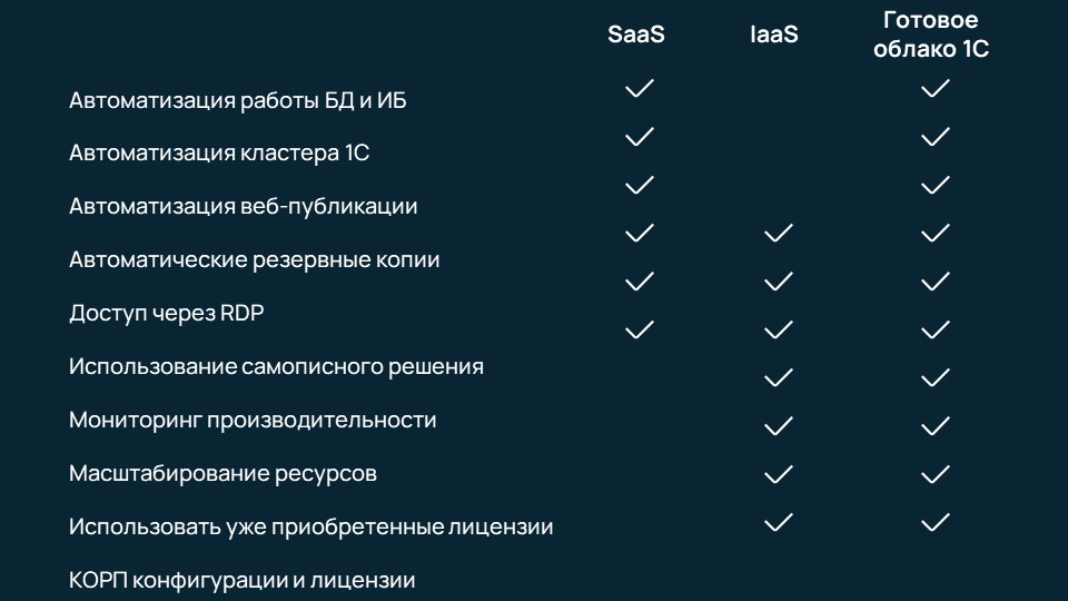Длительное время развертывания: железо приходится ждать долго, иногда до полугода. Помимо этого, мы знаем, что не на всем железе 1С будет работать, поэтому его нужно правильно подобрать, иначе можно совершить ошибку и не получить нужную производительность.