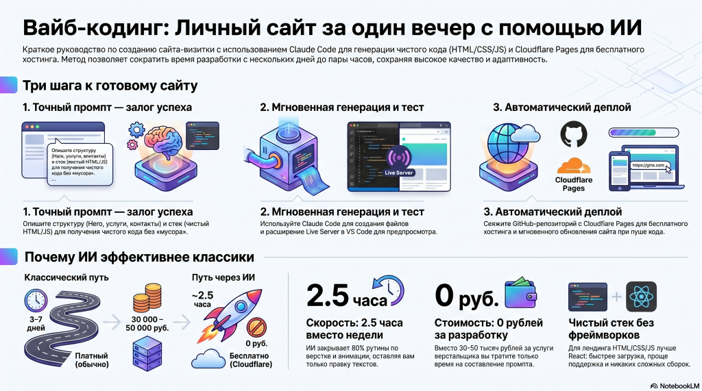 Персональный сайт разработчика — это лендинг. Пять-шесть блоков, немного анимаций, форма обратной связи. Под такую задачу React и Next.js — из пушки по воробьям. А вот чистый HTML/CSS/JS ИИ генерирует на отлично: задача типовая, в обучающей выборке таких сайтов миллионы.
