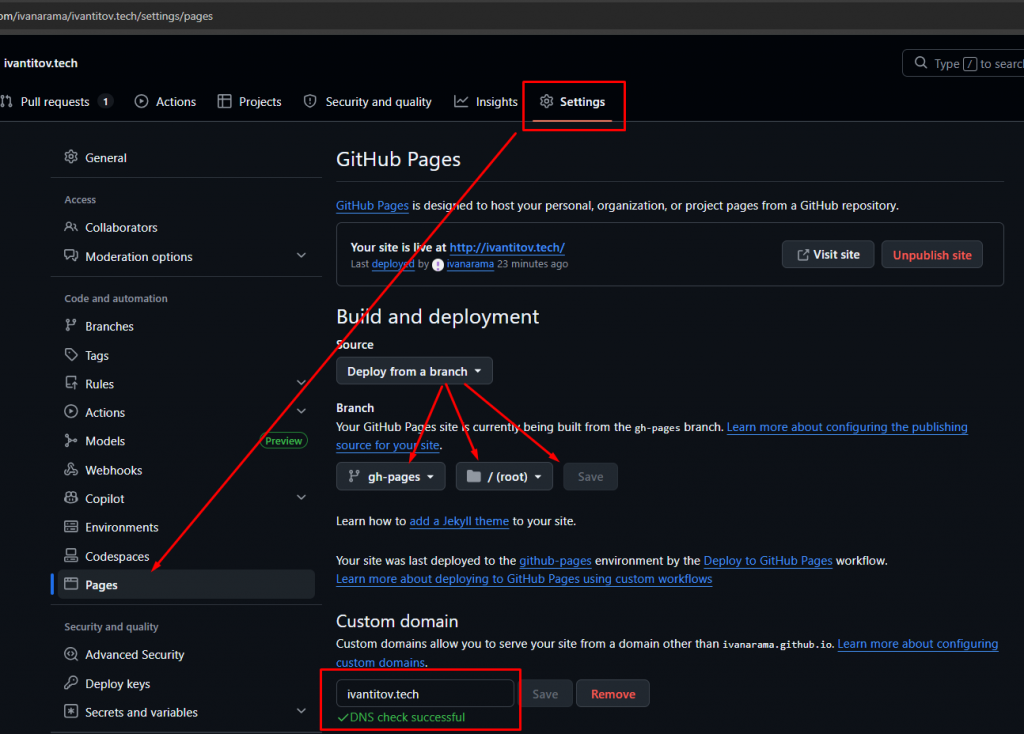 для этого переходим в вашем репо settings->pages и выбираем ветку вашего репо