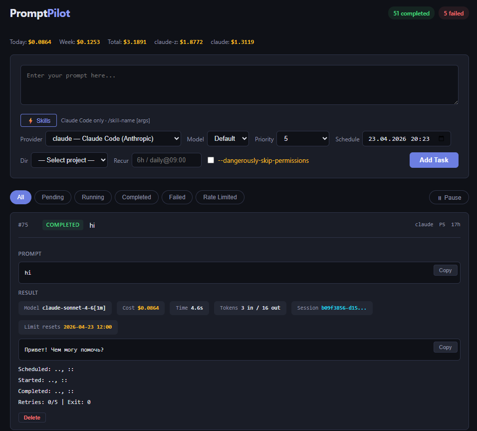 PromptPilot: менеджер задач для Claude Code, Codex и других CLI