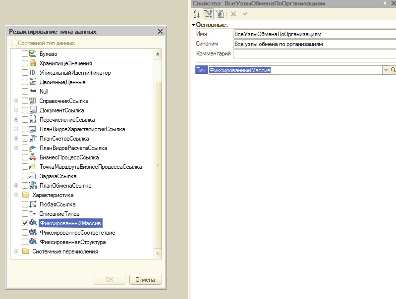 Среди доступных типов мы можем видеть не только стандартные типы (ссылочные типы, примитивные типы данных), но и такие типы как "Фиксированный массив", "Фиксированная структура", "Фиксированное соответствие".