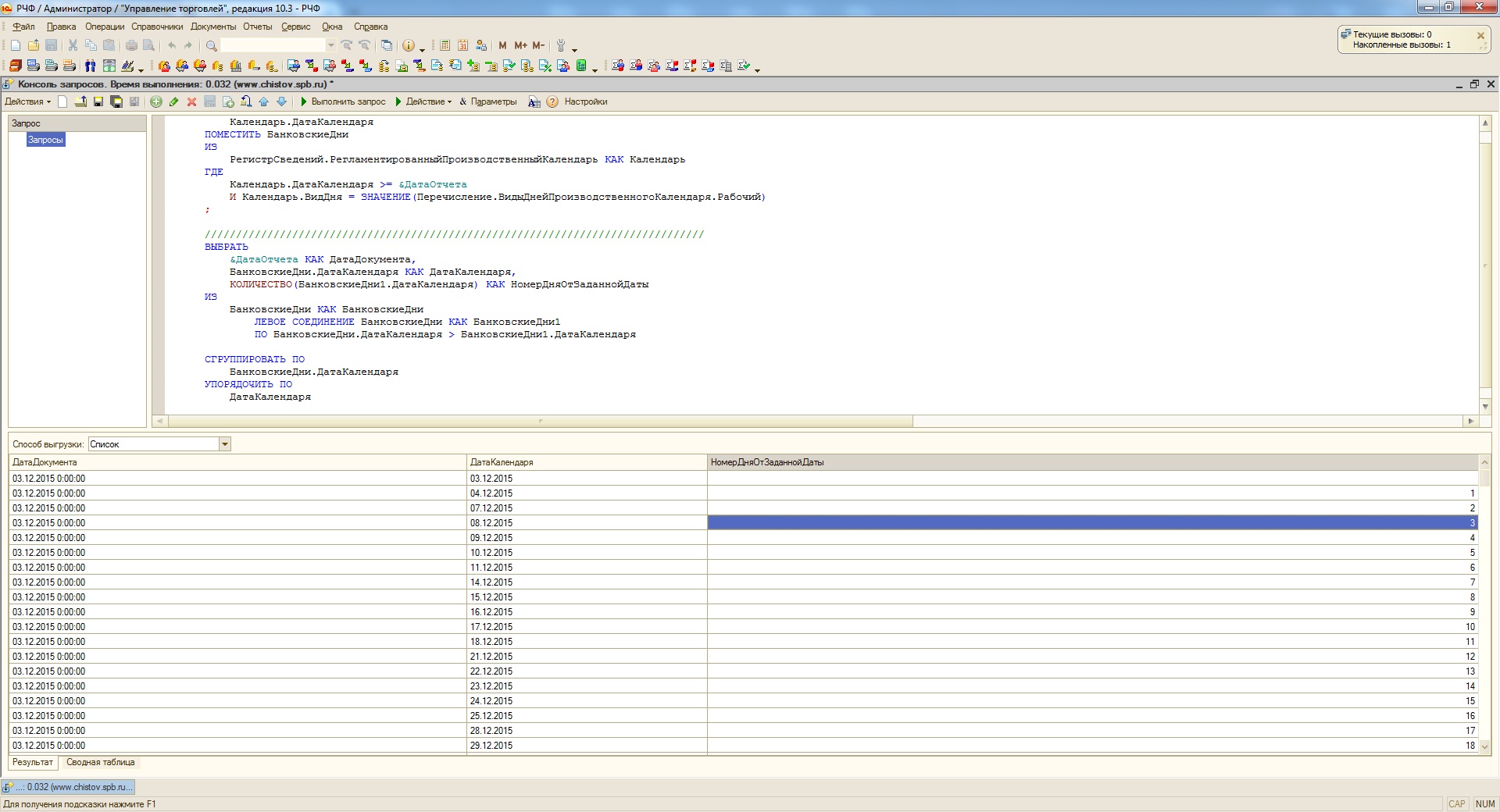 Теперь можно взять любую дату, сравнить ее с получившейся таблицей и узнать, какое количество банковских дней между &ДатаДокумента и любой из дат из результирующей таблицы. Правда, если датой из результирующей таблицы должен быть выходной, то придется пойти на какую-нибудь хитрость, поскольку выходные из этой таблицы исключены!