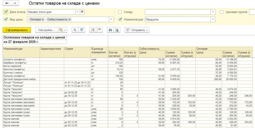 Второй отчет "Остатки товара на складе с ценой и суммой" берет данные из регистра накопления "СвободныеОстатки", где учитываются сколько имеется товара в наличии, в резерве со склада, в резерве под заказ и свободные остатки. Также при выборе вида цены можно вывести цену и сумму имеющего на складе товара, как в наличии, так и в различных резервах.