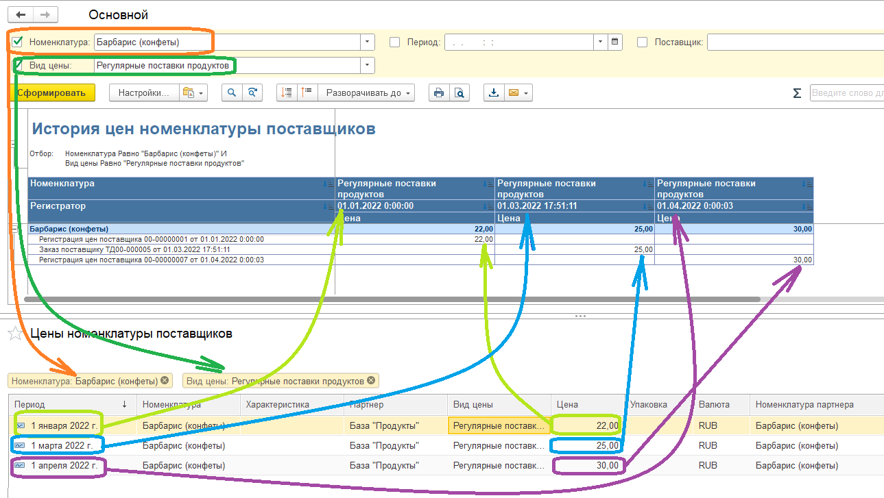 Например, на последнем изображении показана настройка при которой из этого журнала документов можно легко получить аналитический отчёт по динамике цен номенклатуры.