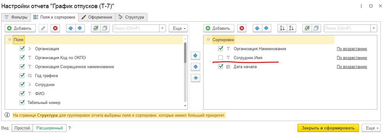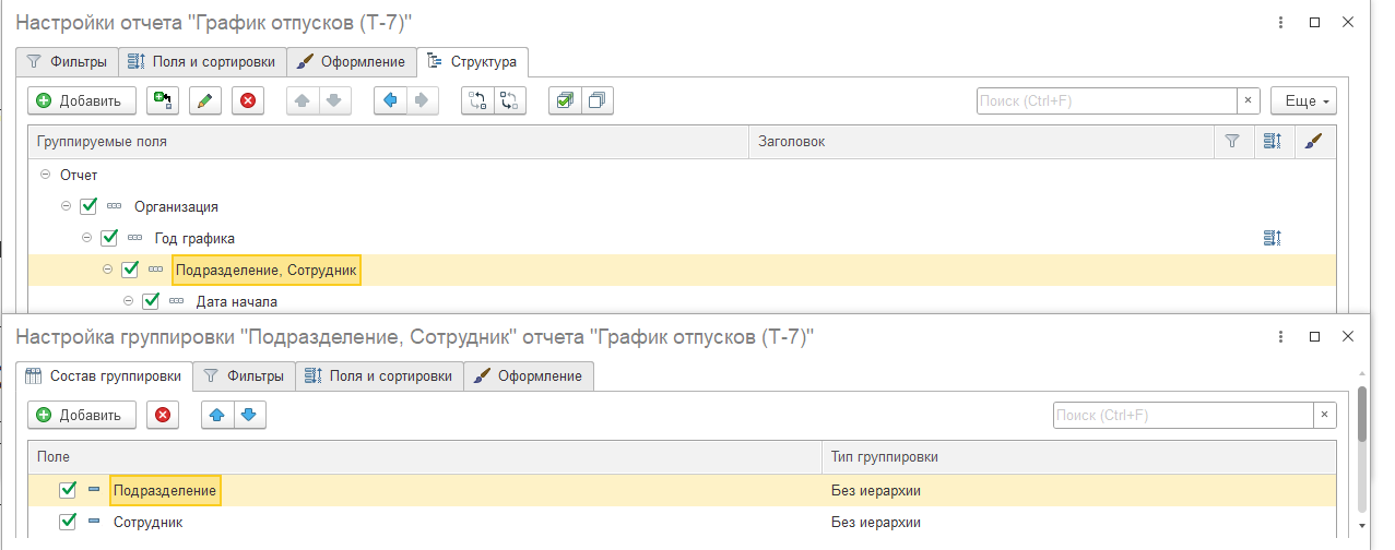 График отпусков (Т-7) с группировкой по подразделению: