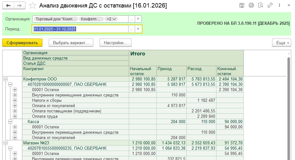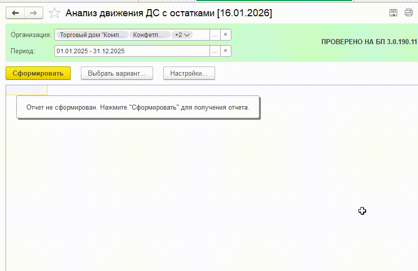 Рис. Работа с отчетом БП "Анализ движения ДС с остаками" 2026!