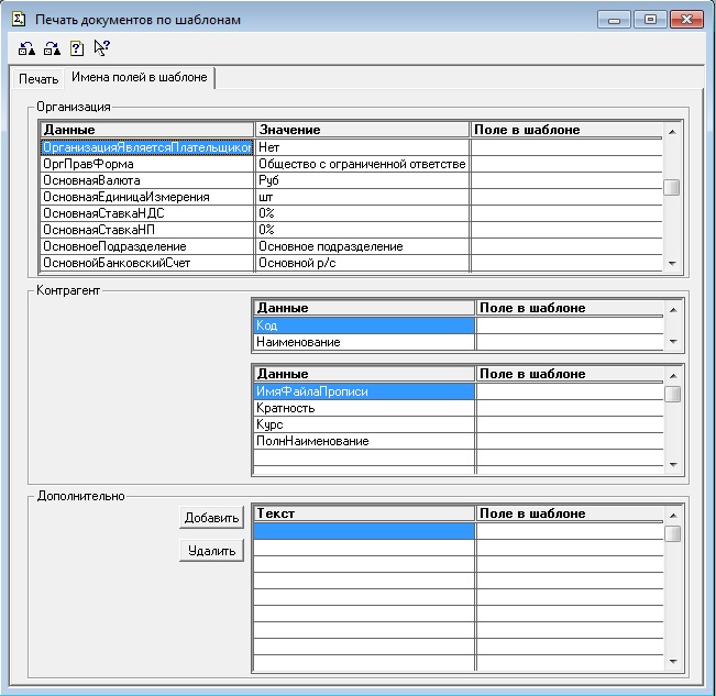 - Первая таблица это все данные организации (периодические имеют значения на дату документа). Задаём поля в шаблоне (двойной щелчок мышкой).