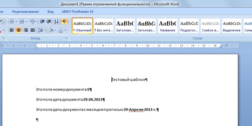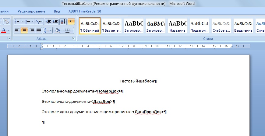 - В шаблоне Word вставляем на нужные места заданные поля.