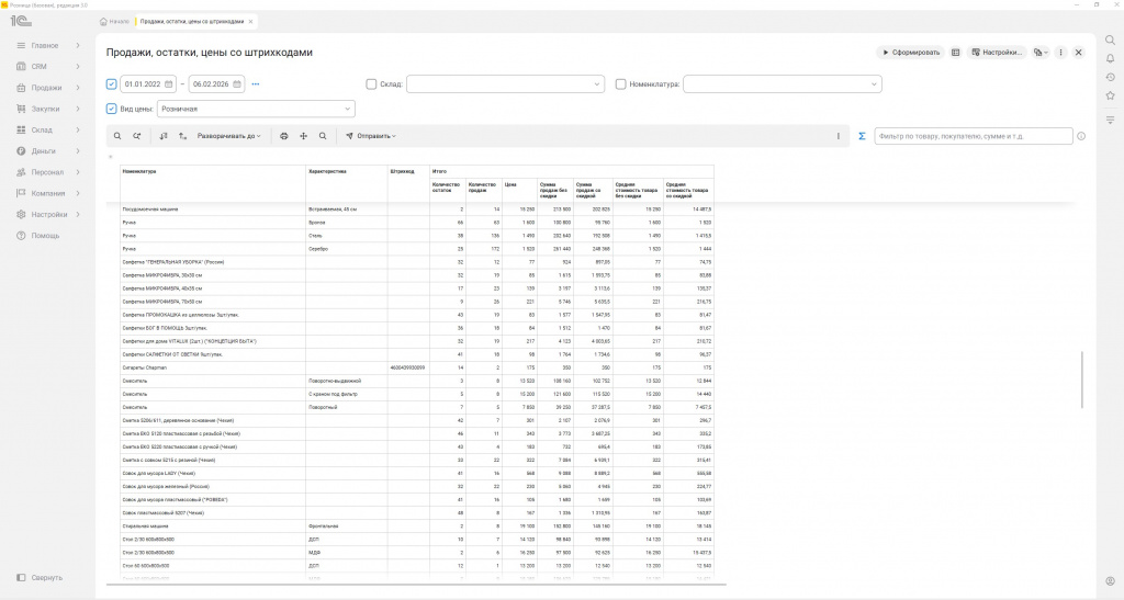 Отчет по продажам, остаткам, ценам, со штрихкодами (УНФ/Розница 3.0)