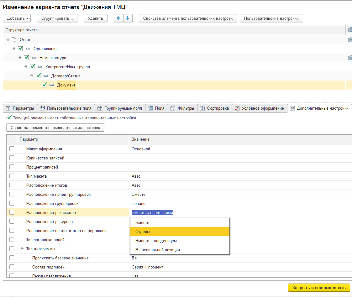 Группировки отчета просто настроить, так как они выведены в форму отчета.