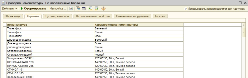 2. По номенклатуре без картинок. Или в разрезе номенклатуры, или в разрезе характеристик (Флажок Использовать характеристики для картинок) При этом т.к. в типовой КА картинки к характеристики привязать нельзя, то привязка идёт по наименованию. (При типовом обмене с сайтом каждая характеристика становится отдельным элементом каталога. В базе соответствующим образом доработана обработка обмена, что б в каталоге были картинки только с нужной характеристикой)