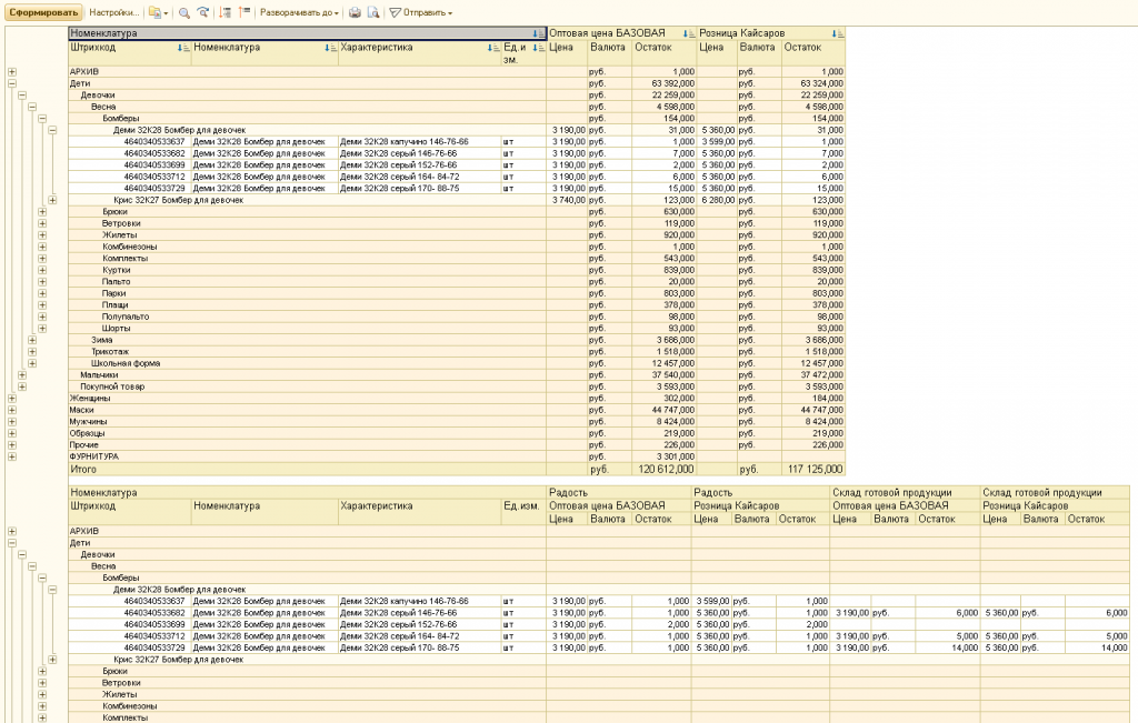 Прайс-лист по видам цен со штрихкодами для УТ 11.5, КА 2.5, ERP 2.5 + Прайс-лист по видам цен со штрихкодами по остаткам на складах для УТ 11.5, КА 2.5, ERP 2.5
