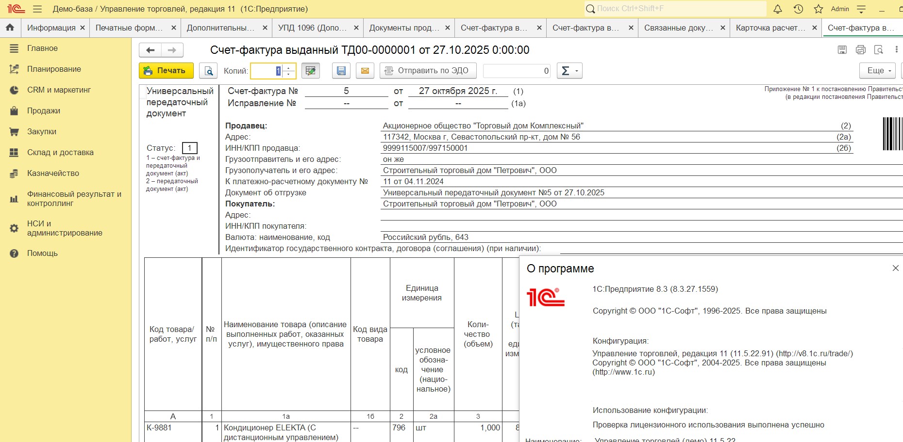 Проверена на Управление торговлей, редакция 11 (11.4.14.78), (11.4.13.187), (11.4.11.84) (11.5.17.74), (11.5.22.91), думаю и на прочих аналогичных релизах должна работать. Архив включает УПД и Счет-фактуру.