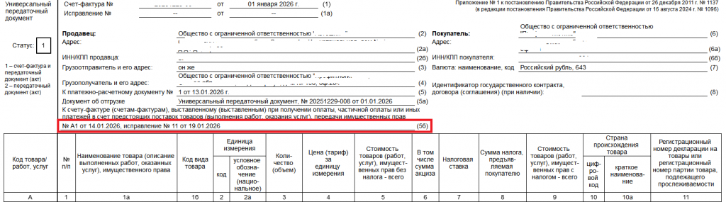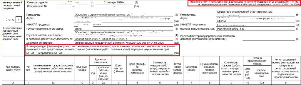 Если дата документа больше или равна 01.10.2024 г., то будет печататься новая версия УПД в редакции №1096.