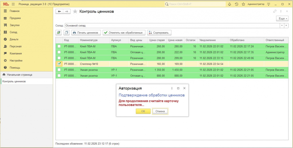 3. Пользователь (продавец) открывает форму "Контроль ценников" и видит на какие товары была изменена цена. Видит остаток, место хранения, старую и новую цену. Далее пользователь должен отметить уведомления как обработанные.