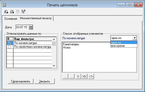 Печать ценников с выбором из 8 типов ценников (начиная со среднего формируется штрих-код), с возможностью отбора по группе номенклатуры или с множественным фильтром, также отбор номенклатуры с остатками на складе больше нуля. Обработку можно использовать как внешнюю печатную форму для документов, у которых есть реквизит табличной части "Номенклатура".