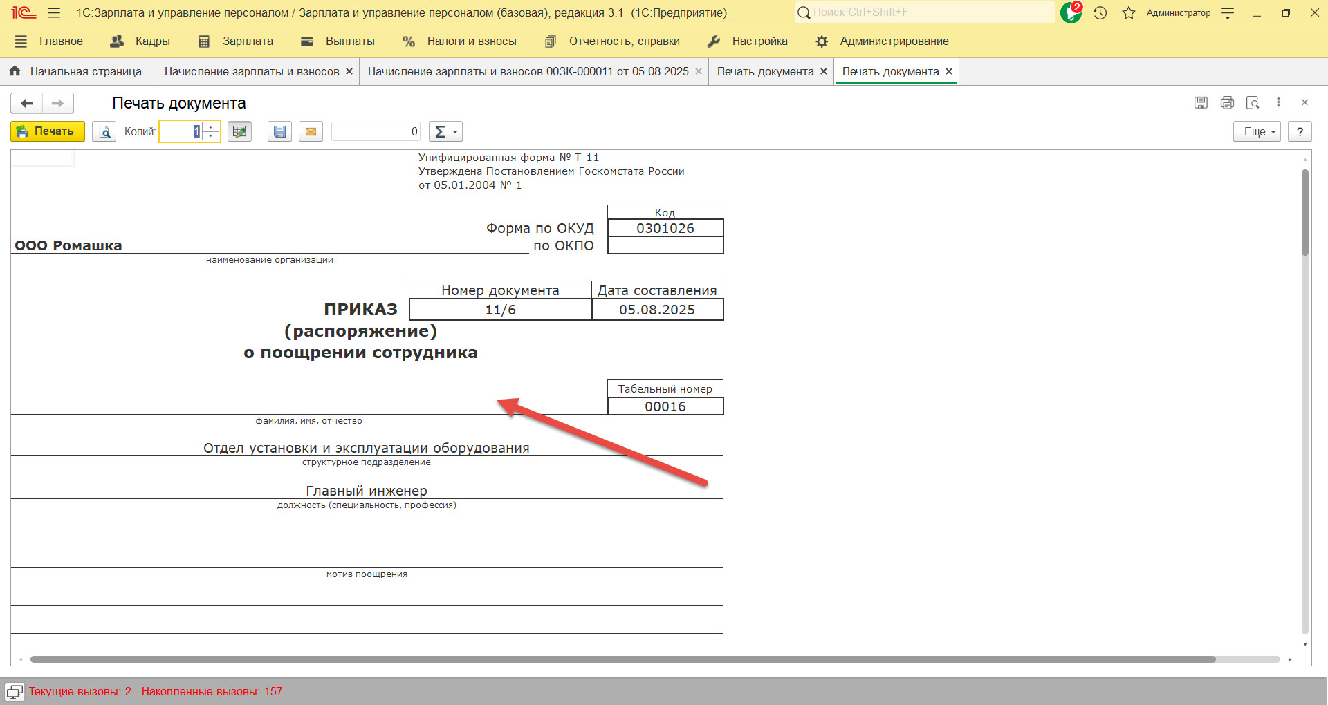 Приказ о поощрении сотрудника Т-11 (Т-11а) документа "Начисление зарплаты и взносов" (устаревший формат)