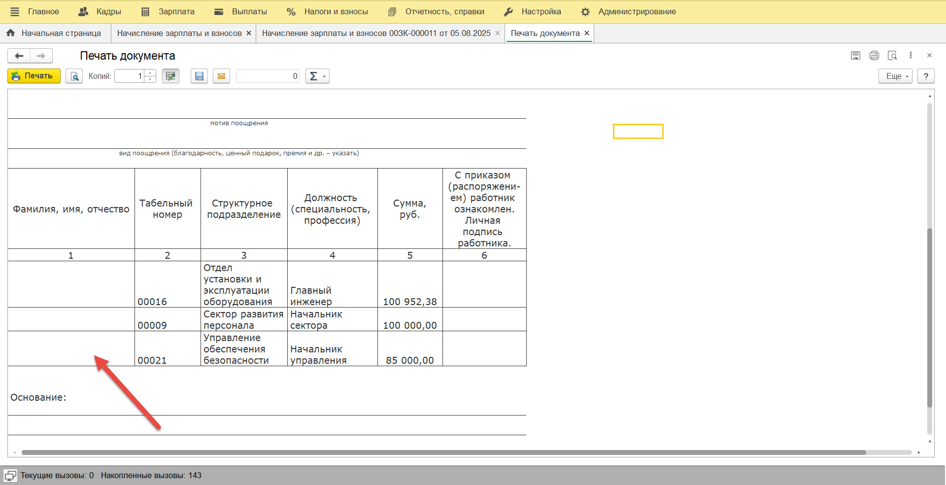 Приказ о поощрении сотрудника Т-11 (Т-11а) документа "Начисление зарплаты и взносов" (новый формат)