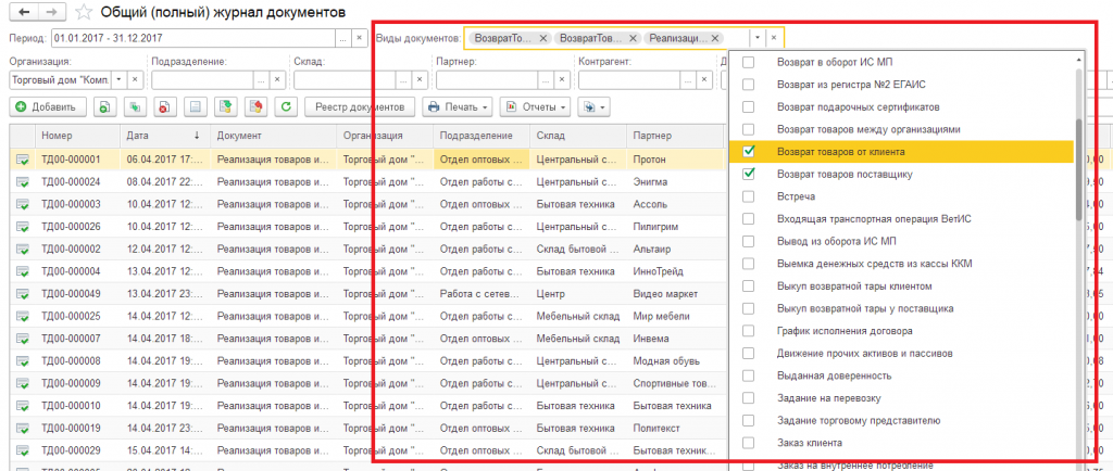 5.1. В открытом журнале выбрать виды документов и установить необходимые отборы;