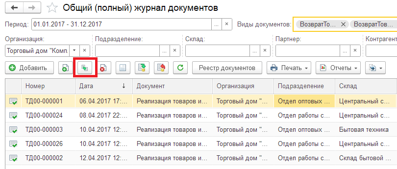 - Групповое проведение, распроведение, пометка на удаление выбранных документов за период