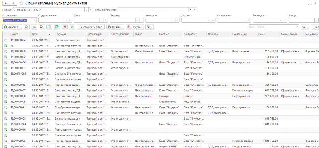 1. Отображение всех созданных документов конфигурации за весь период или выбранный период, в том числе служебных, в одном журнале;
