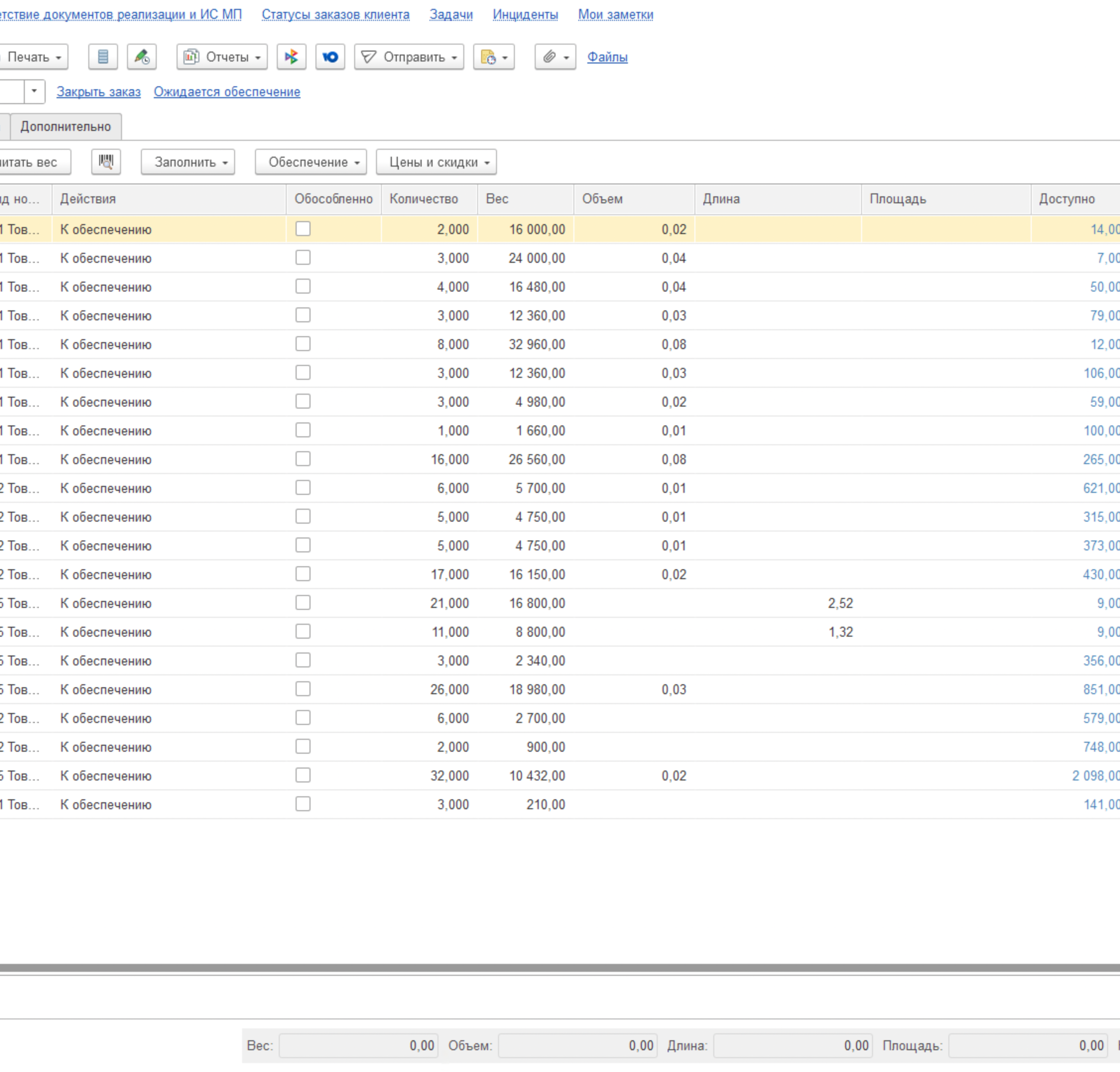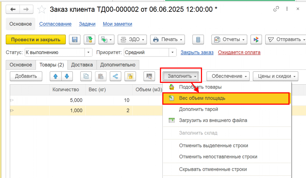 После того, как будет заполнена табличная часть документа "Заказ клиента", чтобы заполнились данные по весу, объему и площади, надо нажать кнопку "Вес объем площадь", после чего будут заполнены данные колонок по весу, объему и площади, а также общий вес, объем и площадь.