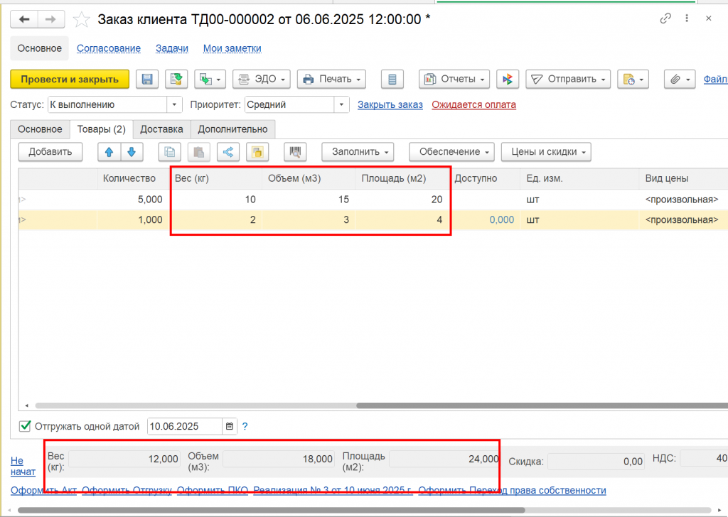 После подключения расширения в документе "Заказ клиента" появятся три колонки в табличной части "Товары": "Вес", "Объем" и "Площадь". А внизу общий вес, общий объем и общая площадь.