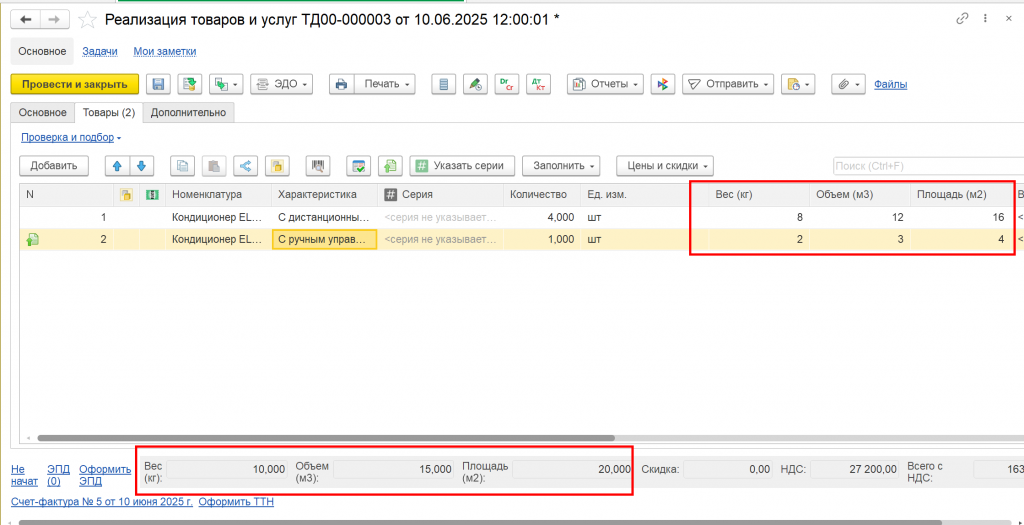 После подключения расширения в документе "Реализация товаров и услуг" появятся три колонки в табличной части "Товары": "Вес", "Объем" и "Площадь". А внизу общий вес, общий объем и общая площадь.