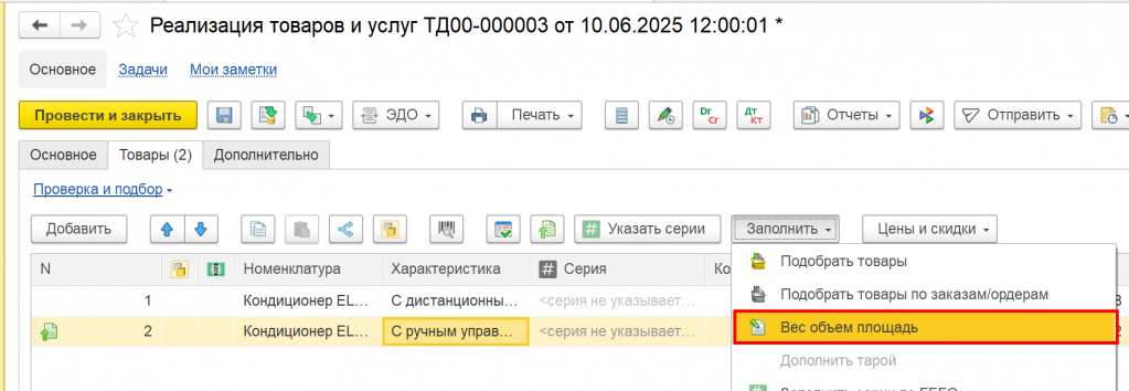 После того, как будет заполнена табличная часть документа "Реализация товаров и услуг", чтобы заполнились данные по весу, объему и площади, если они не заполнились автоматически, то надо нажать на кнопку "Вес объем площадь", после чего будут заполнены данные колонок по весу, объему и площади, а также общий вес, общий объем и общая площадь.
