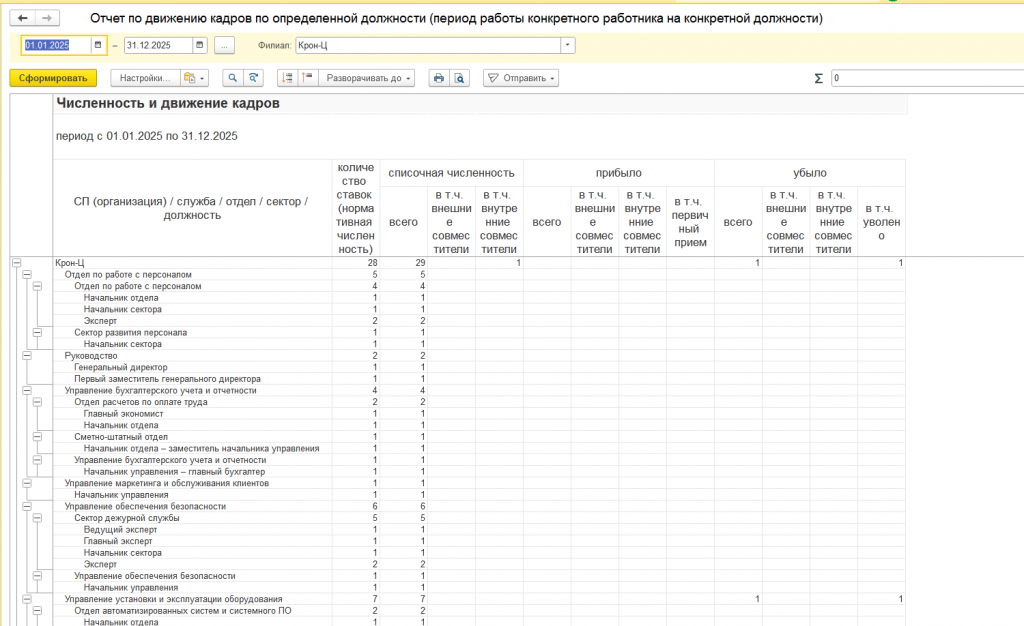 Отчет автоматически собирает данные о нормативной численности, списочной численности, а также о кадровых движениях (приемы, увольнения, перемещения).
